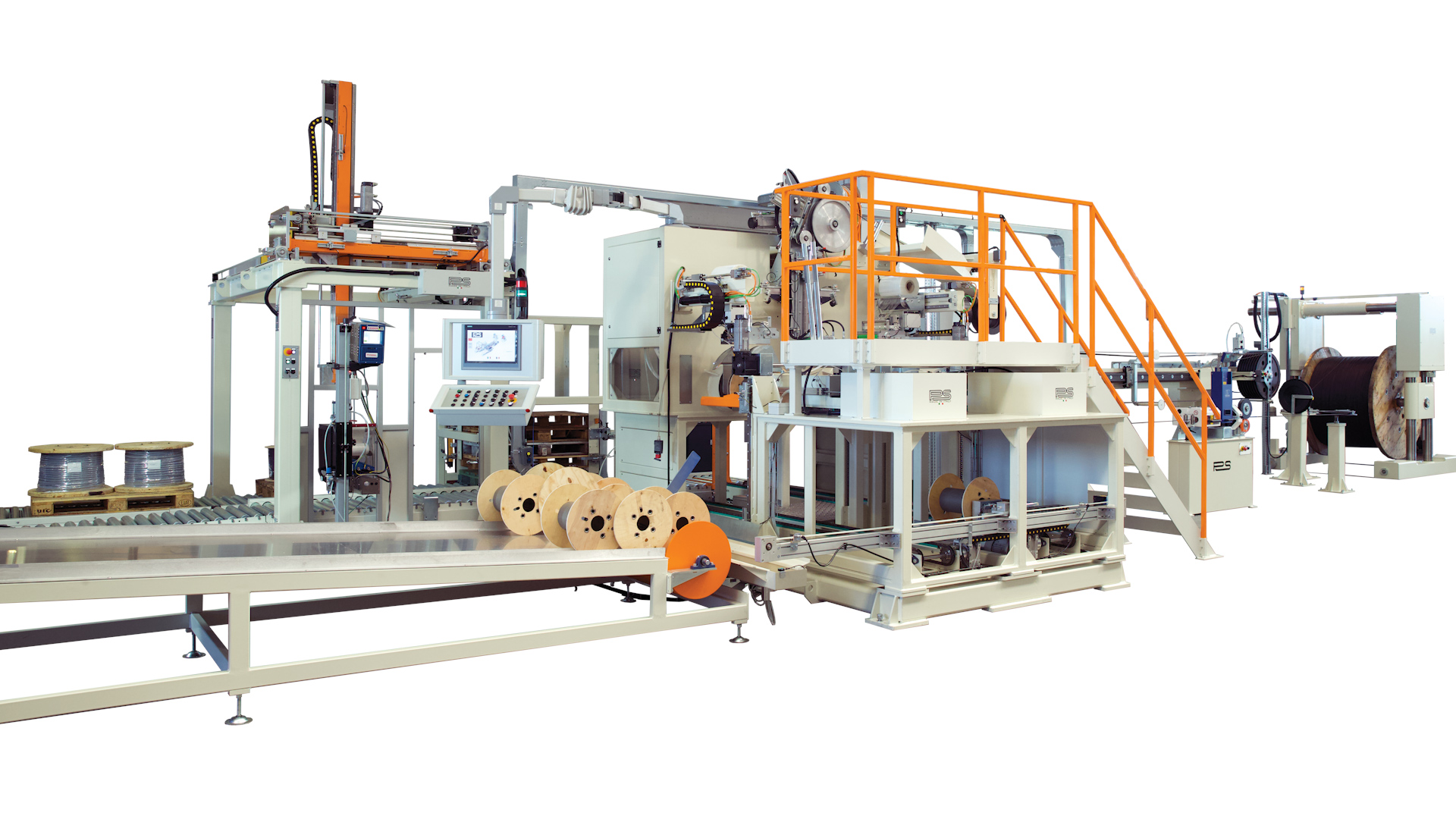La linea è composta da: due sistemi di svolgimento cavo, 1 etichettatrice elettronica, 1 unità pallet automatica, alcuni strumenti di controllo, quali, spark tester, lump detector e stampante cavo.