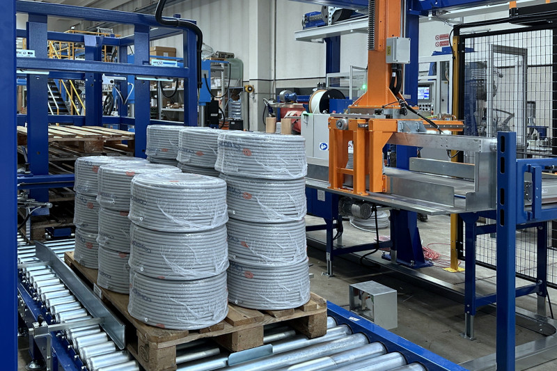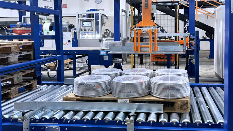 Automatic Coiling Line for multicore cables. In its standard version, it is equipped with a Horizontal Accumulator, which guarantees a continuous line functioning, thus obtaining a production of 3 coils per minute, having a length of 100 meters (according to the diameter of the cable).