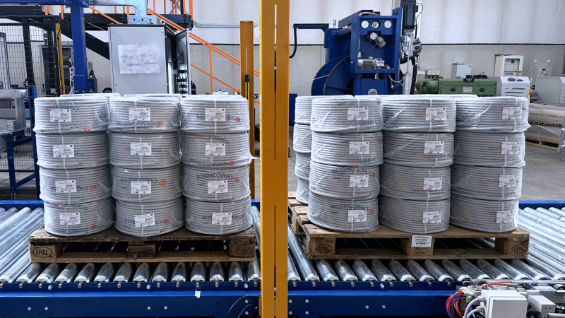 Linea Automatica di matassatura per cavi multipolare, nella versione standard è equipaggiata di accumulatore orizzontale garantendo un processo di lavoro continuo, raggiungendo una produzione di 3 matasse al minuto da 100 metri (in funzione del diametro del cavo).