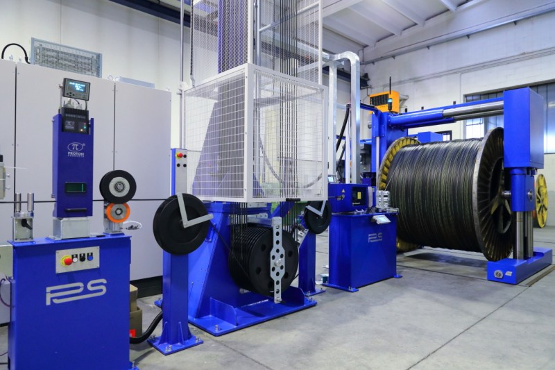 La linea è composta da: due sistemi di svolgimento cavo, 1 etichettatrice elettronica, 1 unità pallet automatica, alcuni strumenti di controllo, quali, spark tester, lump detector e stampante cavo.